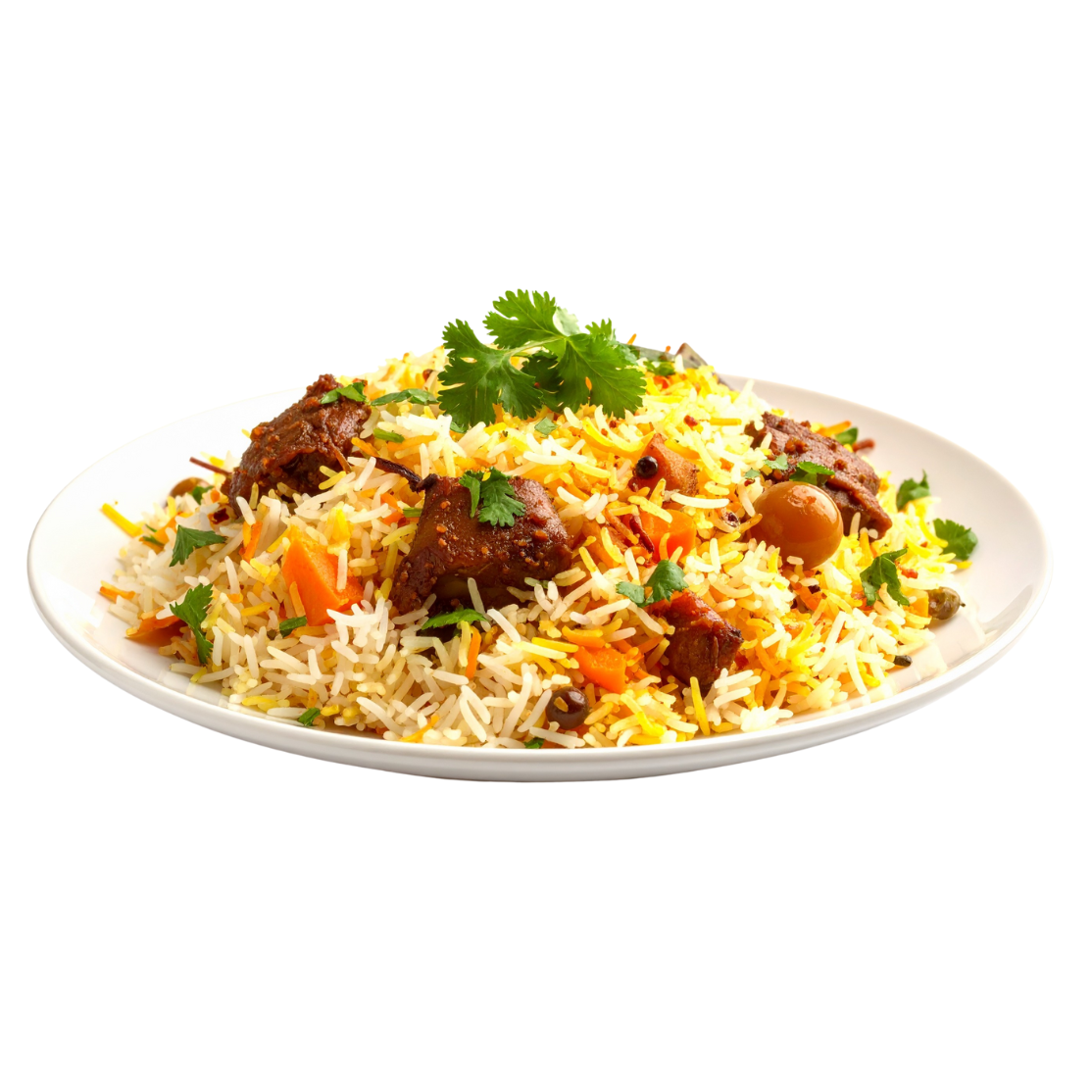 Indulge in the royal taste of Hyderabadi Goat Dum Biryani — a true delicacy made with succulent pieces of goat meat marinated in yogurt and traditional hand-ground spices. Layered with aged basmati rice and slow-cooked in sealed dum style, this biryani captures the perfect balance of aroma, taste, and texture. Every spoonful reveals tender meat and richly flavored rice, making it a satisfying meal for those who love authentic Indian biryani traditions.